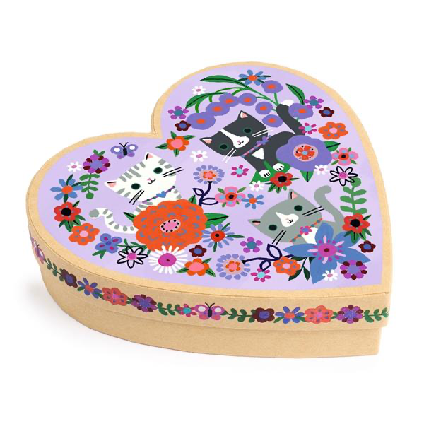 Cette jolie boîte en forme de cœur décorée de petits chats tout mignons cache 3 adorables bracelets.