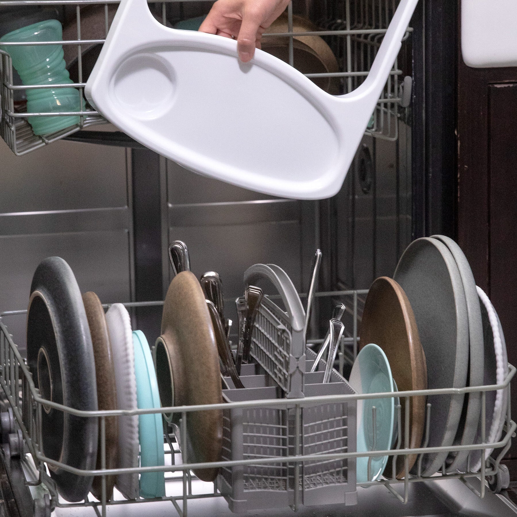 Le plateau amovible sans BPA se range soigneusement sous le siège d'appoint ; nettoyez la base et l'insert en mousse en les essuyant avec un chiffon humide et du savon doux et laissez sécher à l'air libre ; le plateau va au lave-vaisselle.