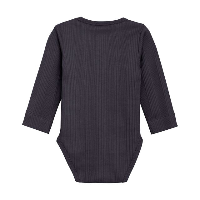 Cache-couche EN FANT en côtes et de couleur unie. Confectionné dans une douce qualité de coton agréable au contact de la peau. Ce body présente des manches longues, une encolure ronde et des boutons-pression entre les jambes.
