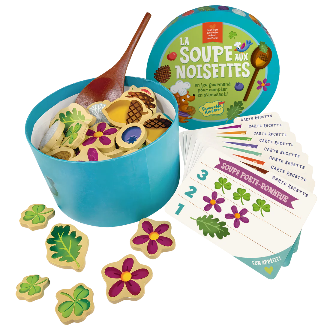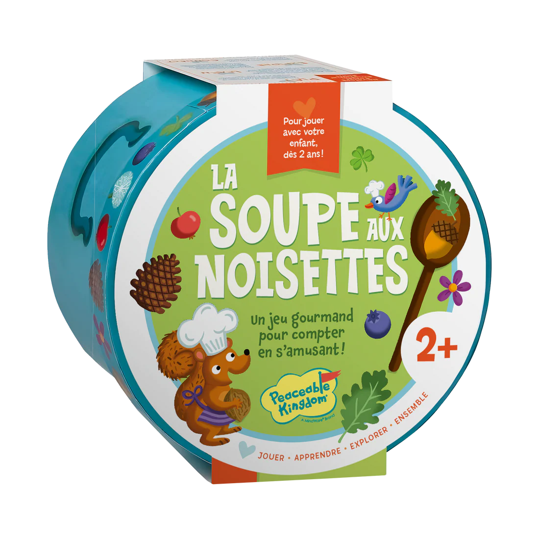 Préparer la soupe aux noisettes est simple comme bonjour ! Le fond rond de la boîte sert de bol, qui contient des ingrédients en bois et une solide cuillère en bois pour mélanger et remuer. Des fiches de recettes simples apprennent aux tout-petits à identifier les ingrédients et à compter pendant qu'ils cuisinent. Mélangez, remuez, mangez et jouez ensemble !