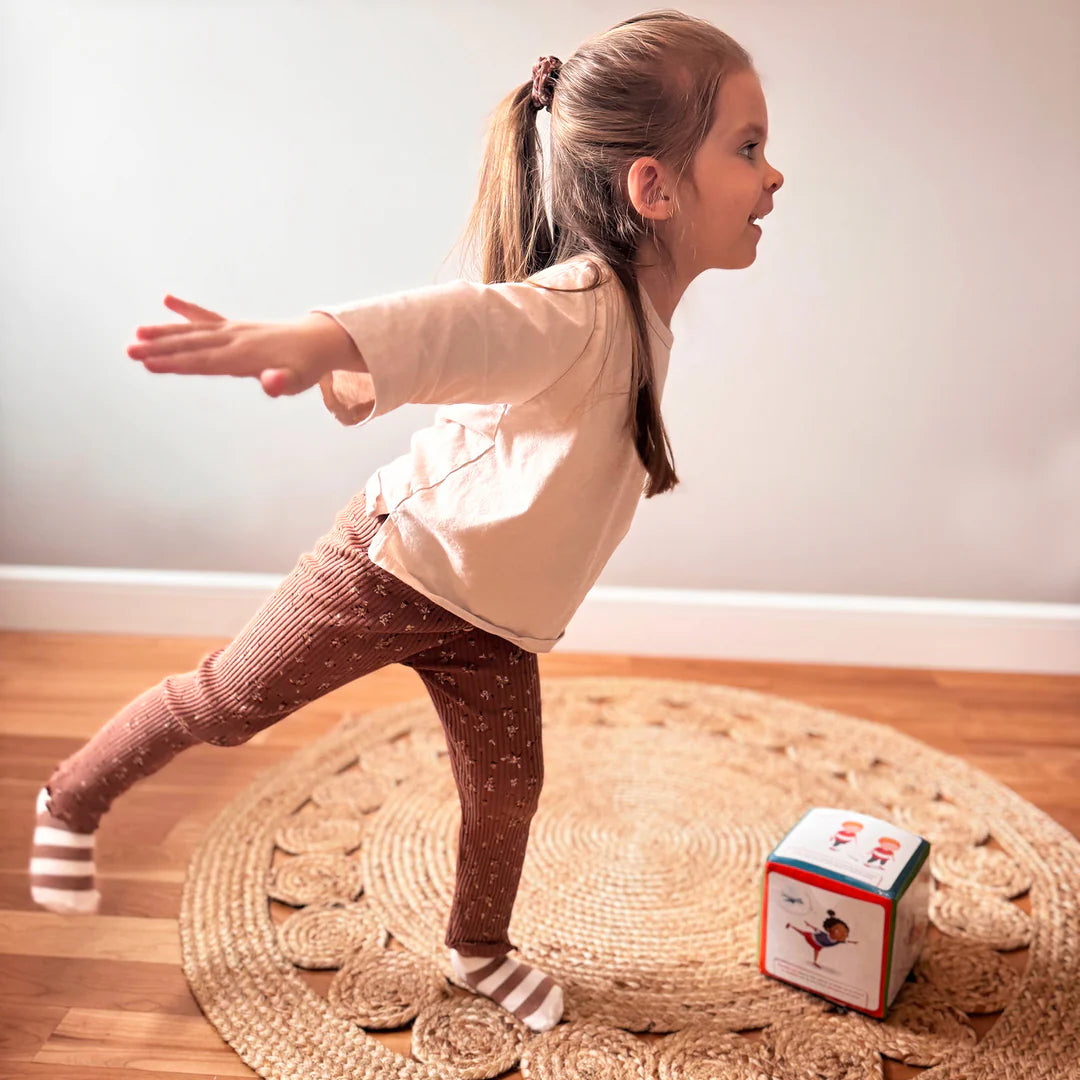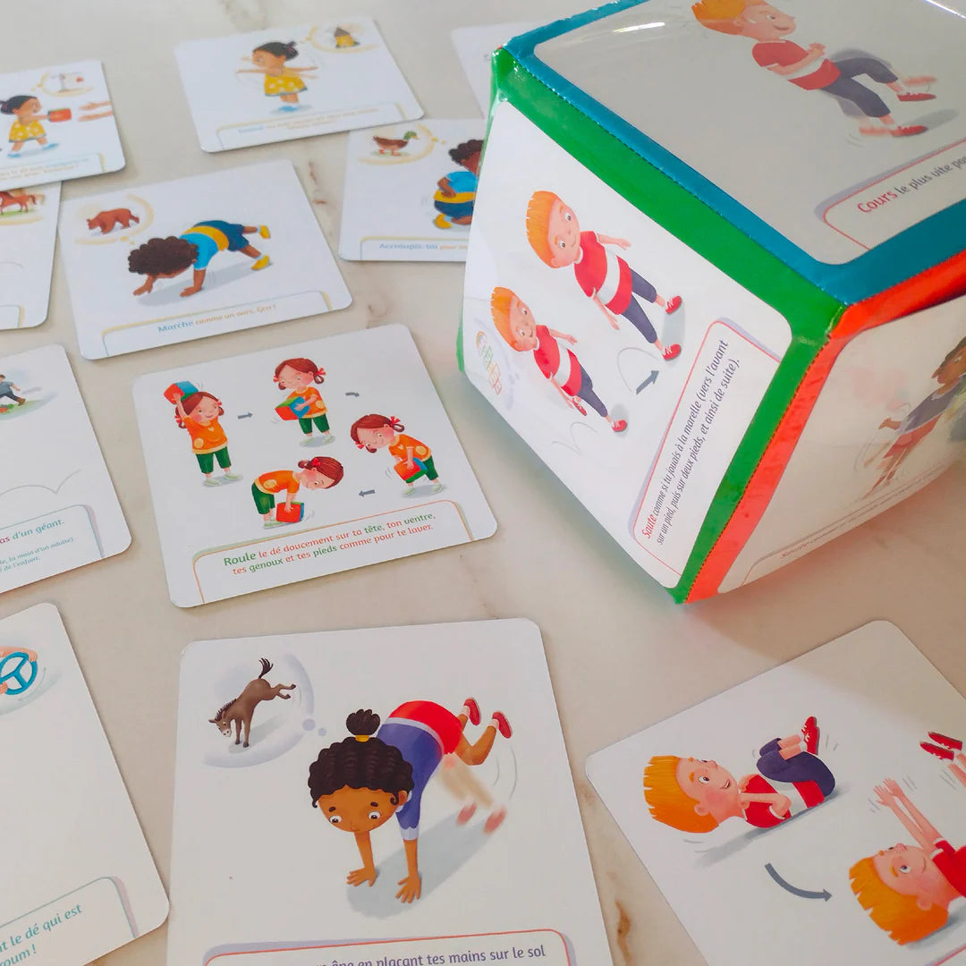 Lance le dé en l’air et reproduis l’action illustrée! Rampe en imitant un train qui entre dans un tunnel! Tourne comme une toupie sur toi-même! Tiens toi en équilibre sur un pied comme un flamant rose! Marche comme un crabe sans que tes fesses touchent le sol! Réalise toutes sortes de mouvements amusants avec ou sans l’aide d’un adulte!