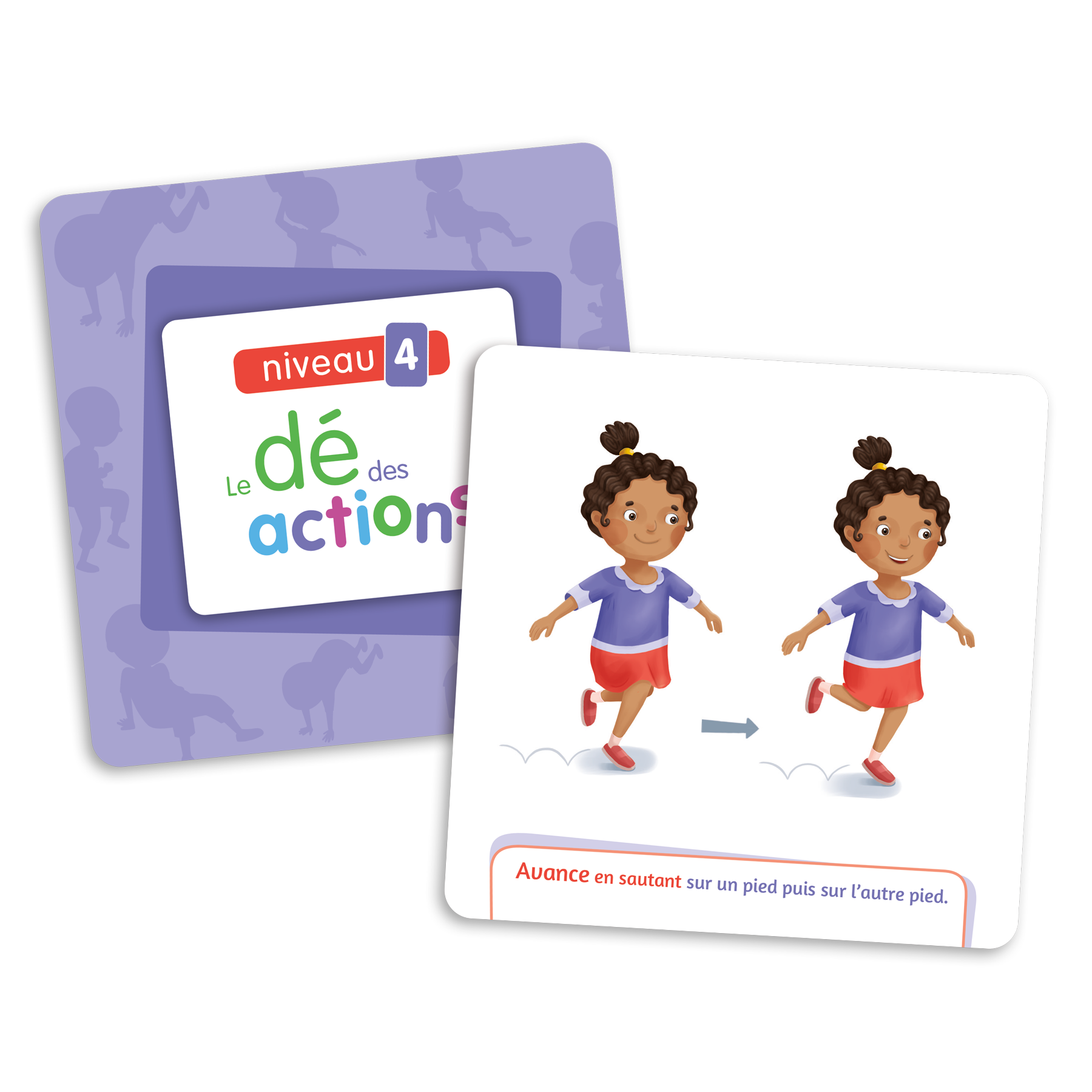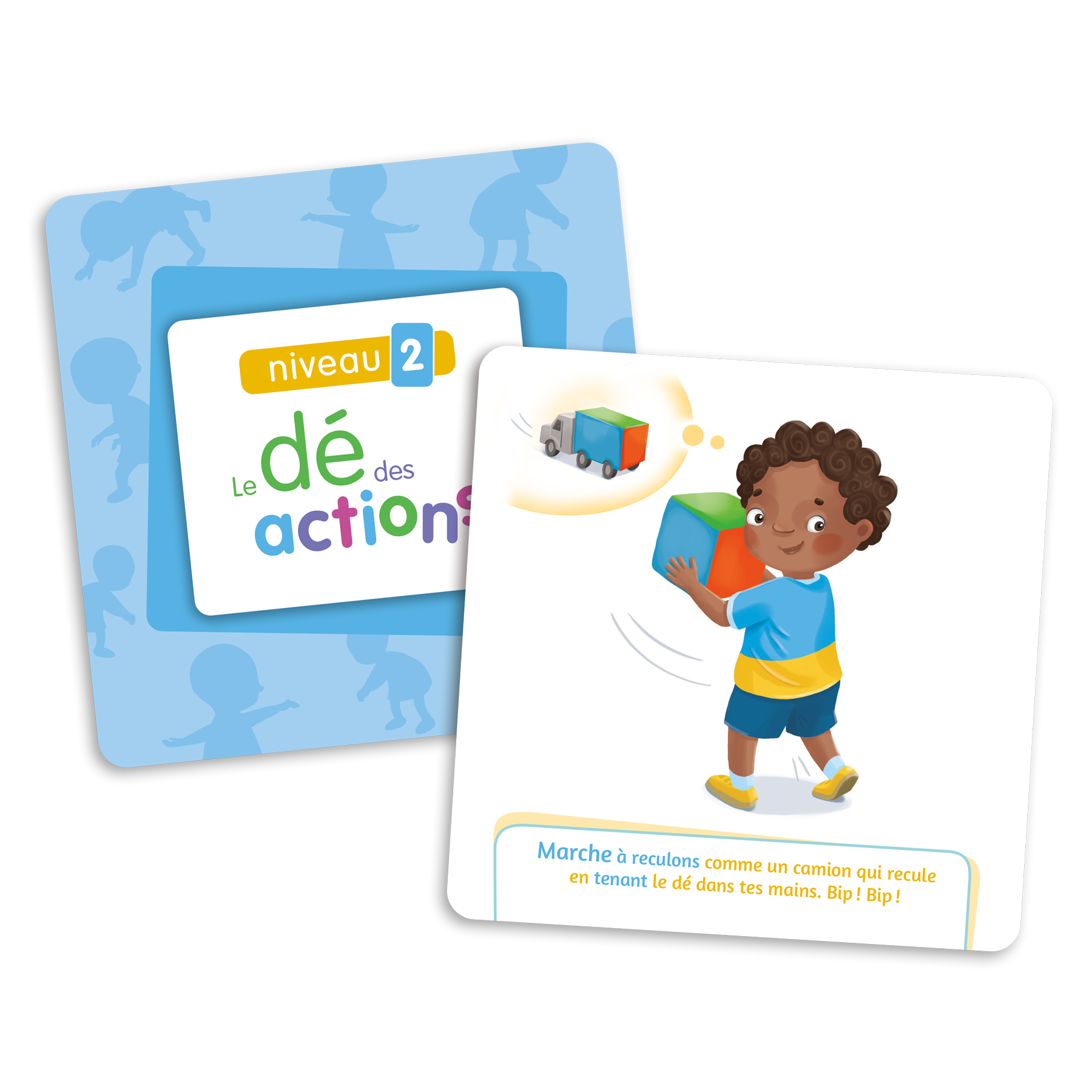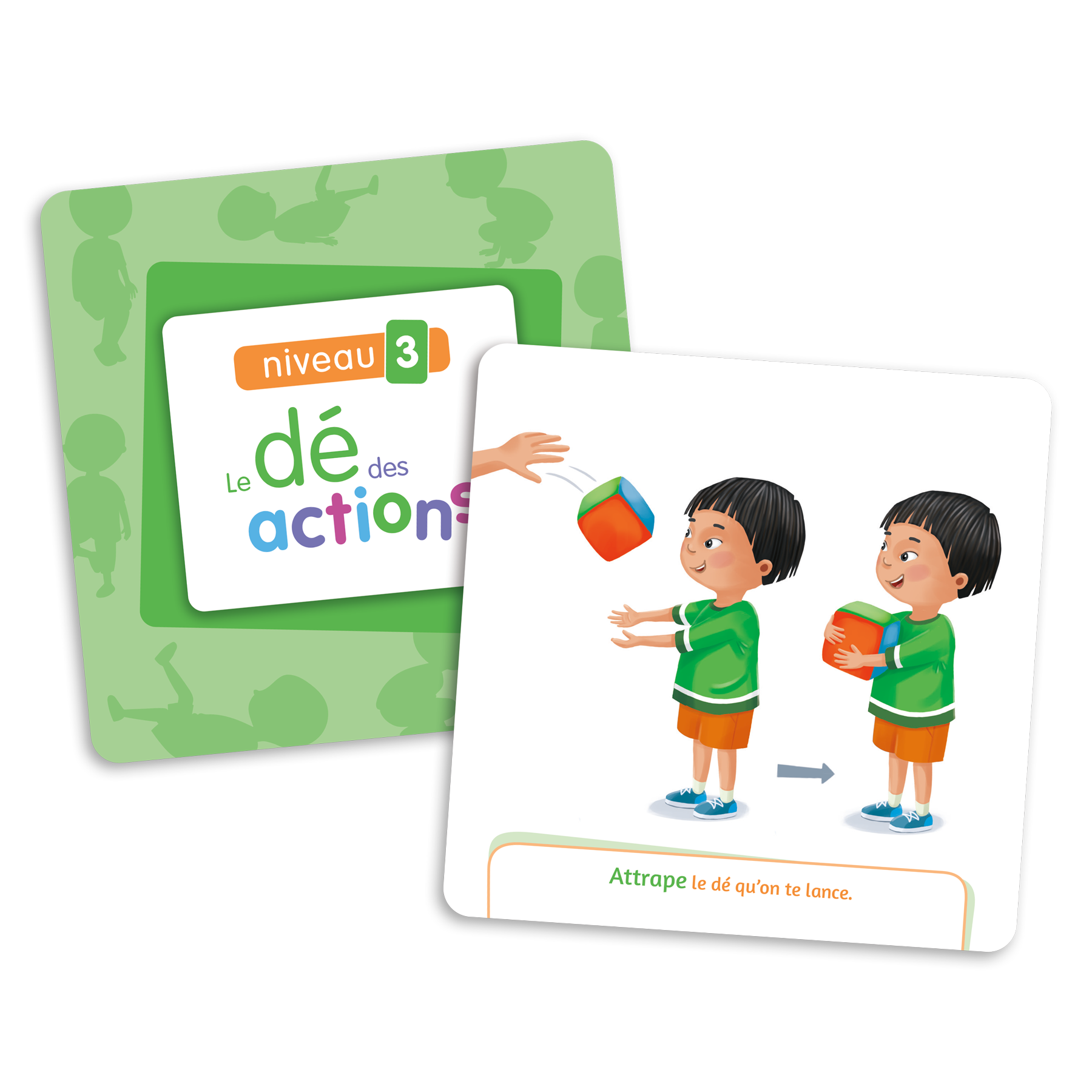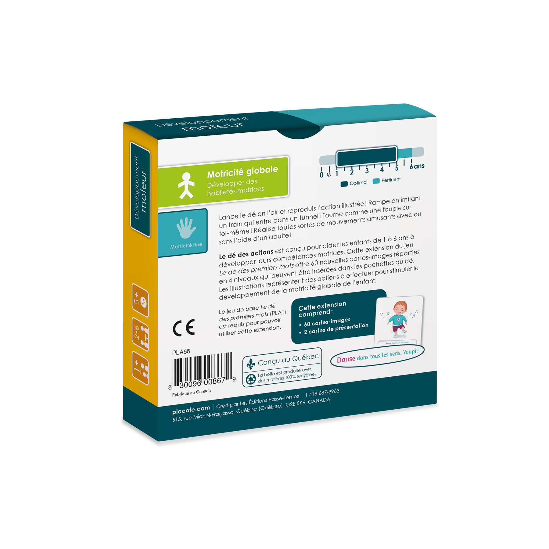 Le dé des actions est conçu pour aider les enfants de 1 à 6 ans à développer leurs compétences motrices. Cette extension du jeu Le dé des premiers mots offre 60 nouvelles cartes images réparties en 4 niveaux qui peuvent être insérées dans les pochettes du dé. Les illustrations représentent des actions à effectuer pour stimuler le développement d’habiletés motrices (ex. : ramper, s’accroupir, se tenir en équilibre, sauter). Le jeu contribue ainsi à l’acquisition de compétences fondamentales pour le développement de la motricité globale de l’enfant.