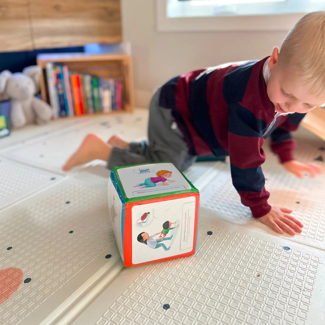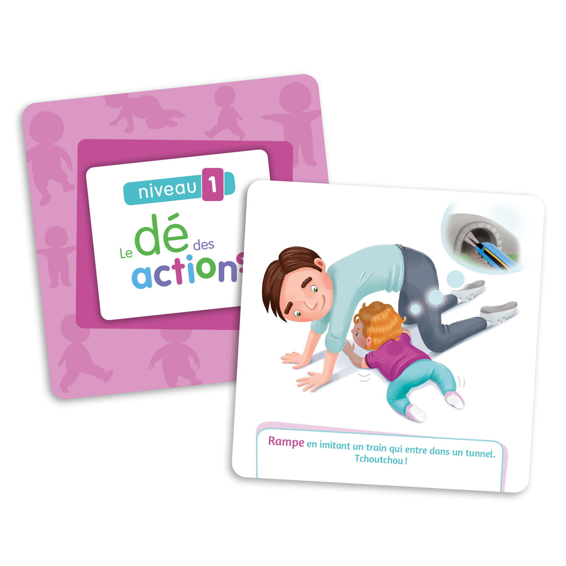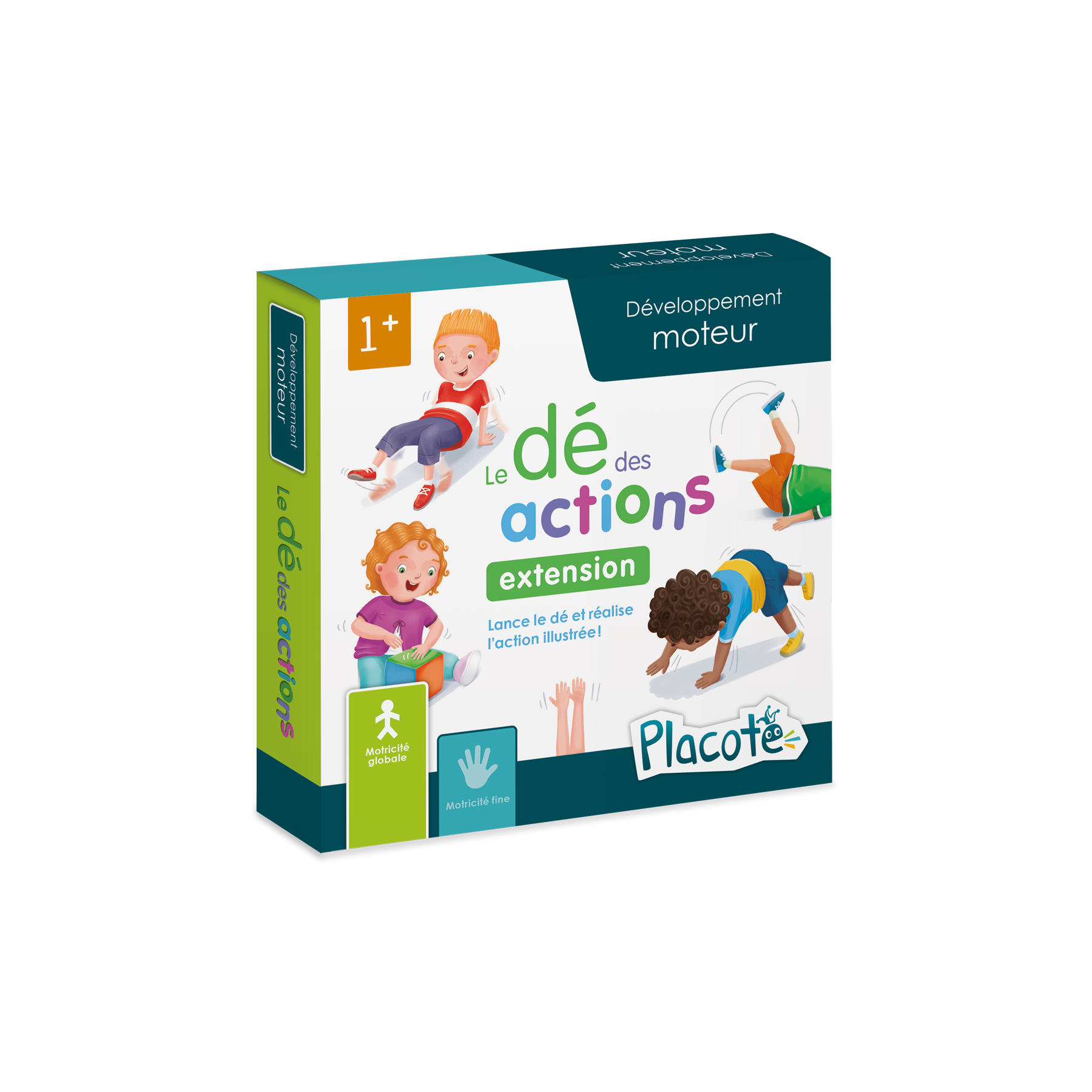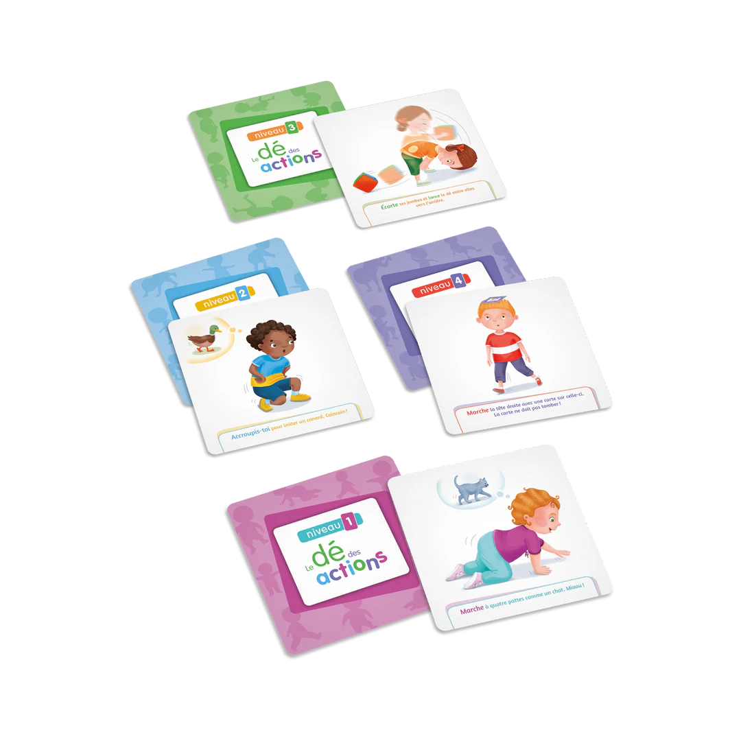 Le dé des actions est conçu pour aider les enfants de 1 à 6 ans à développer leurs compétences motrices. Cette extension du jeu Le dé des premiers mots offre 60 nouvelles cartes images réparties en 4 niveaux qui peuvent être insérées dans les pochettes du dé. Les illustrations représentent des actions à effectuer pour stimuler le développement d’habiletés motrices (ex. : ramper, s’accroupir, se tenir en équilibre, sauter). Le jeu contribue ainsi à l’acquisition de compétences fondamentales pour le développement de la motricité globale de l’enfant.