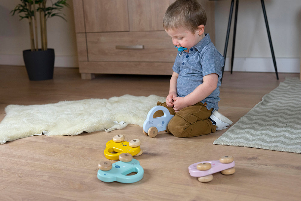 Cette voiture profilée est faite de bois de hêtre certifié FSC de qualité et a été décorée avec une belle couleur bleue en utilisant de la peinture à base d’eau non nocive pour les enfants. Les tout-petits prennent facilement la voiture par la poignée pour conduire la voiture ou l’emmener où elle veut. La conception simplifiée de la voiture, les couleurs douces combinées avec des roues en bois naturel sont parfaits pour stimuler le développement motrice de votre tout-petit. Votre enfant entre dans son monde fantastique avec style. En plus, la voiture met en valeur chaque chambre d’enfants!