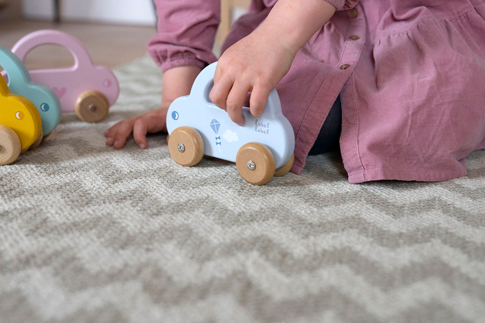 Cette voiture bleue en bois avec poignée assure des heures de plaisir. Les petites mains peuvent la contrôler parfaitement et l’emmener n’importe où!