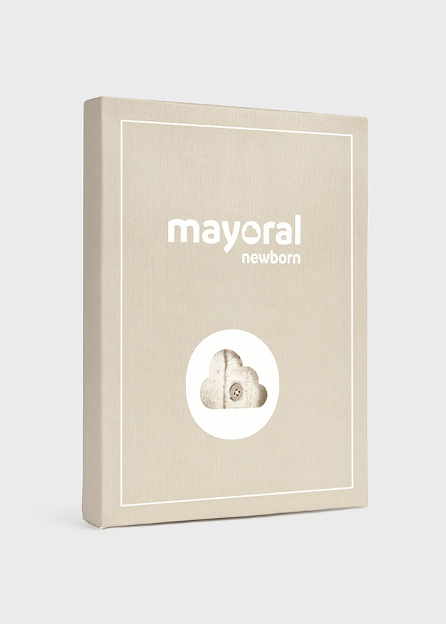 Grenouillère à manches longues pour nouveau-né. Fermeture avec des boutons sur le devant. Fermeture par bouton à l'entrejambe. Motif de point jacquard. Il s'agit d'un article de design unisexe d'une grande polyvalence en raison de la neutralité de ses tons et de sa forme.