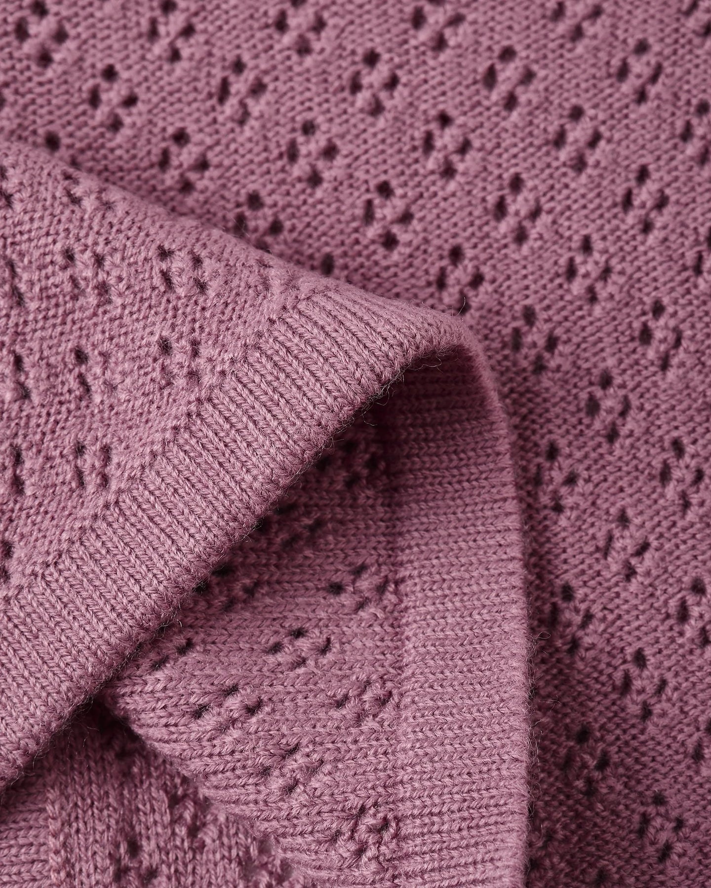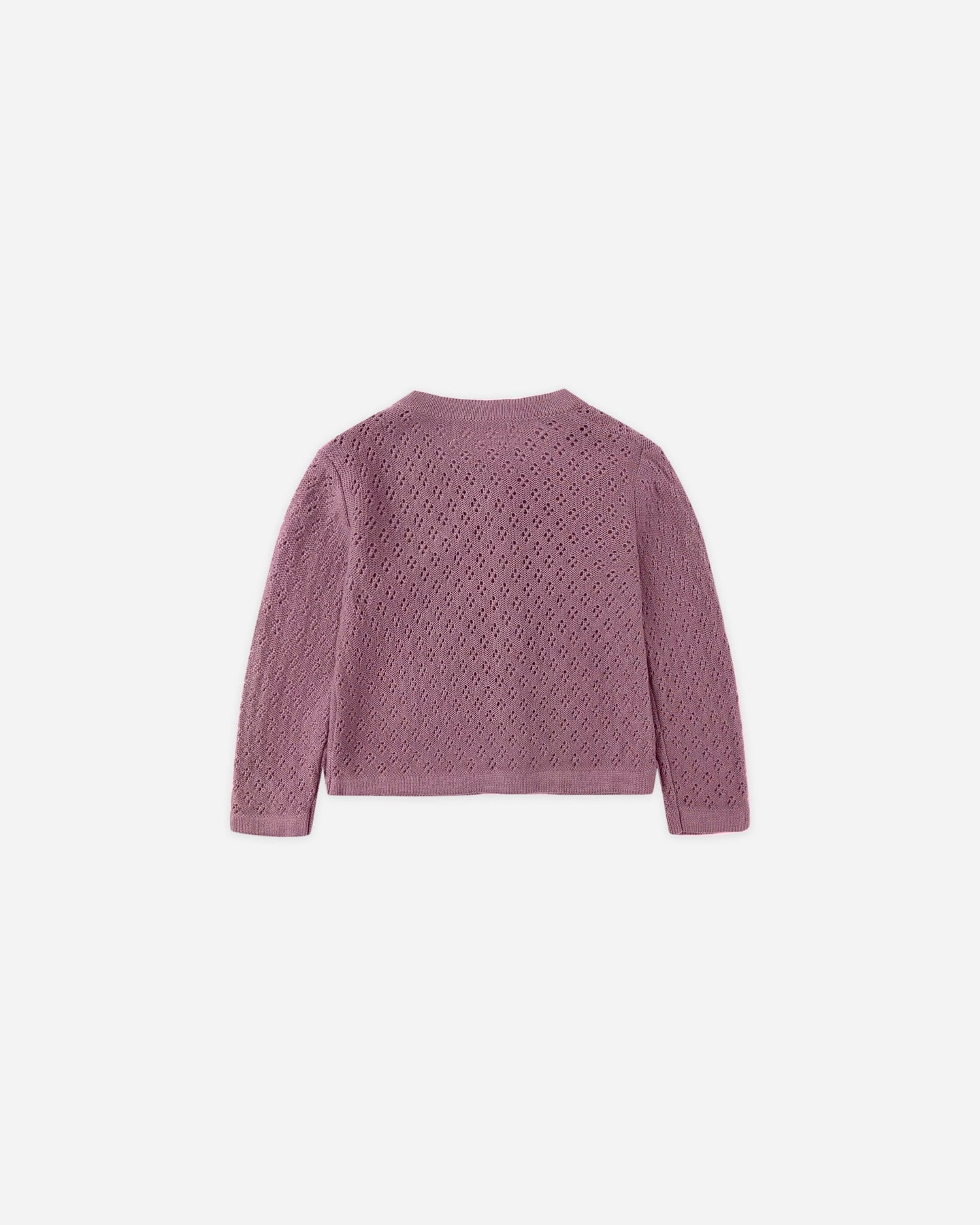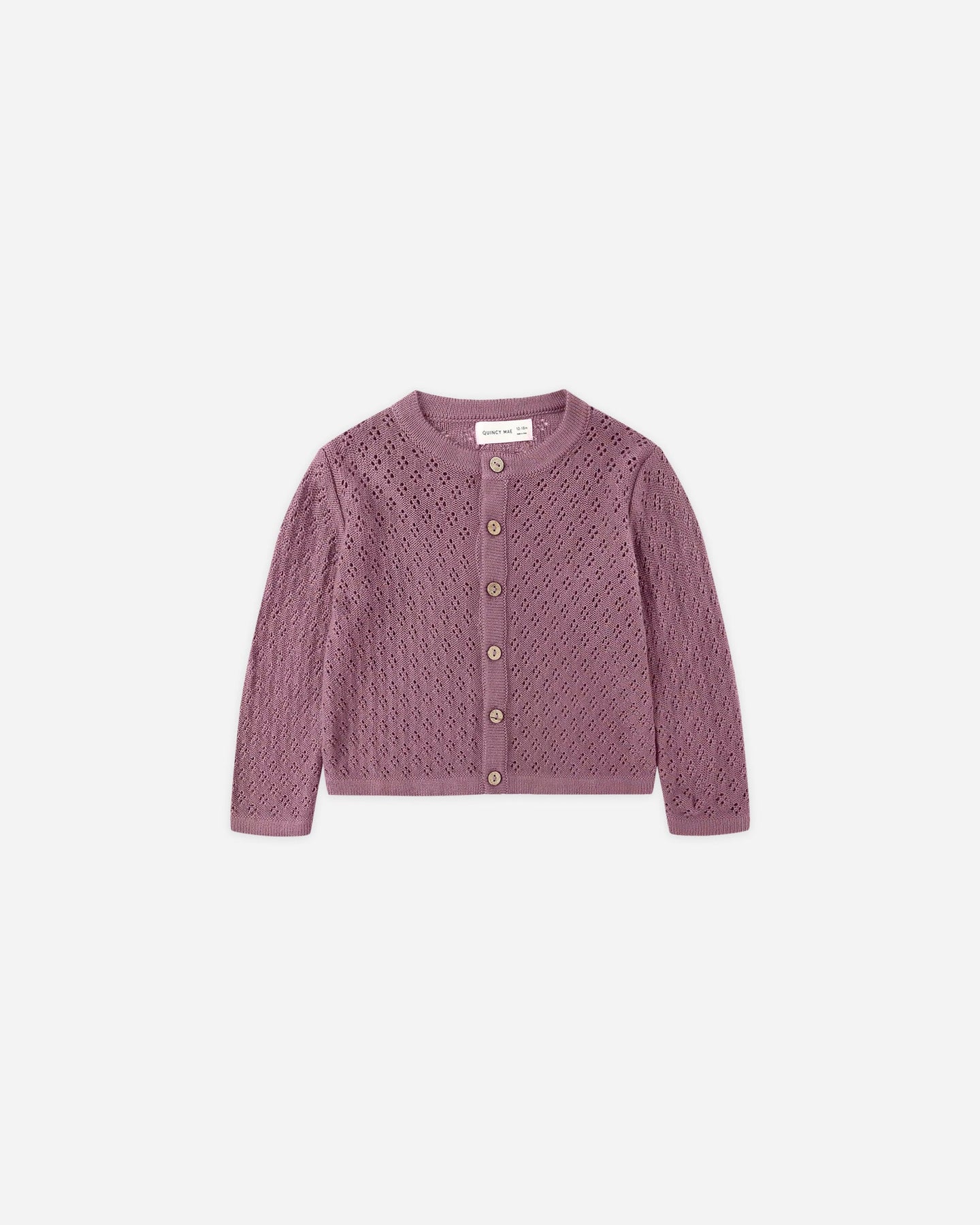 Ce charmant cardigan présente un joli motif en maille pointelle et des boutons en noix de coco pour un look encore plus mignon.