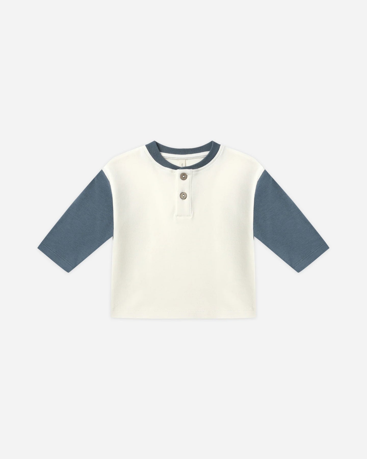 Chandail à manches longues douillet à coupe décontractée, avec manches, encolure et patte de boutonnage contrastantes, agrémenté de boutons en noix de coco pour un habillage facile.
