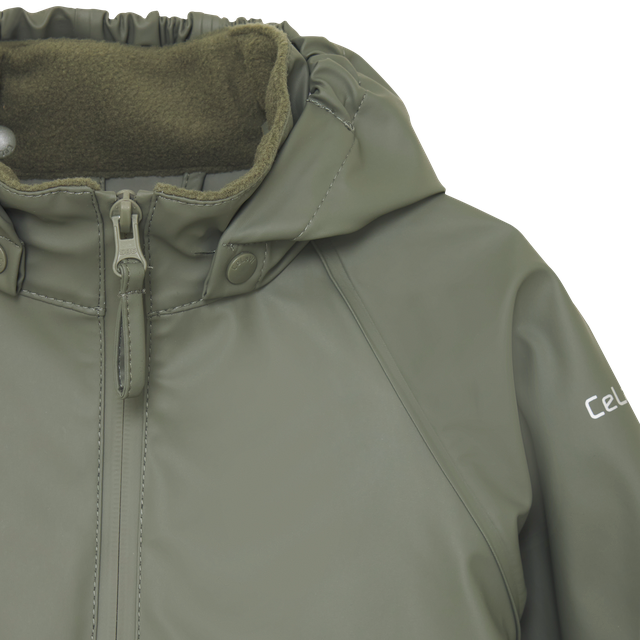 La veste de pluie CeLaVi est équipée d’une capuche amovible fixée par des boutons-pression. L’ouverture de la capuche, les poignets et la taille sont élastiqués pour un meilleur ajustement.