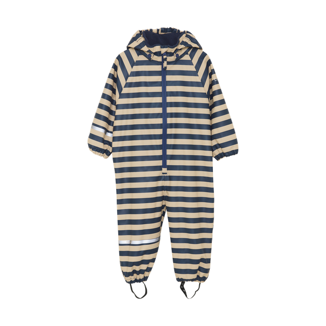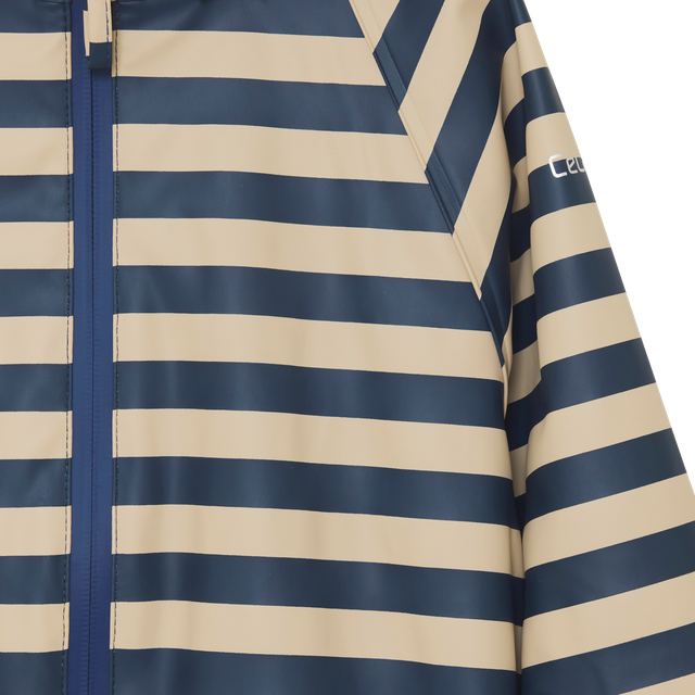 L’ensemble de pluie CeLaVi est doté d’une capuche amovible fixée au col par des boutons-pression. Il se ferme à l’avant par une fermeture éclair imperméable. L’ouverture de la capuche, les poignets et la taille sont élastiqués pour un meilleur ajustement.