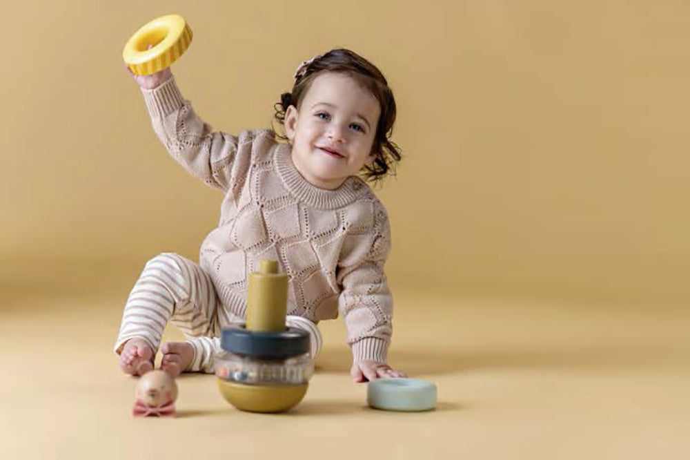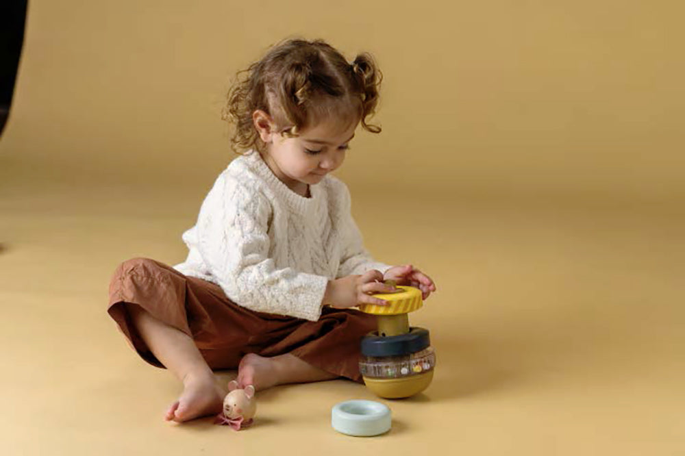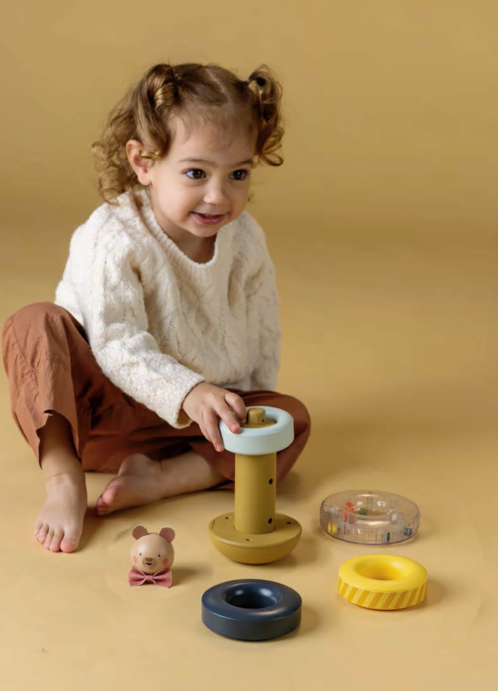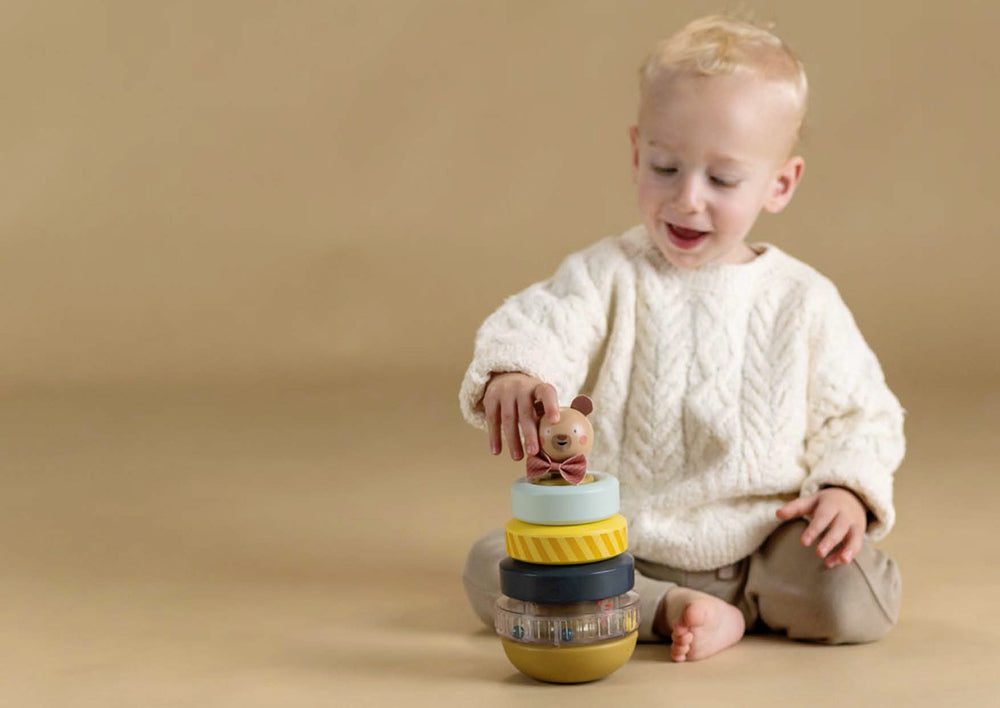 Empilez, secouez, roulez et jouez! Les anneaux à empiler Ourson sont des empileurs vibrants et attrayants conçus pour les petits. Chaque ensemble comprend quatre anneaux colorés - deux pleins, un avec des motifs audacieux comme des rayures ou un damier, et un anneau transparent rempli de perles qui s'entrechoquent pour un plaisir sensoriel supplémentaire. Surmontés d'une tête d'ourson, ces jeux d'empilage encouragent la motricité fine, la coordination œil-main et la résolution précoce de problèmes. De plus, les anneaux se tiennent sur le côté, ce qui permet aux bébés de les faire rouler pour un jeu encore plus dynamique!