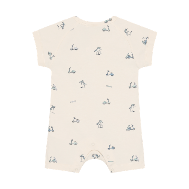 Le romper présente un imprimé intégral et se ferme à l’aide de boutons à l’avant ainsi qu’à l’entrejambe.