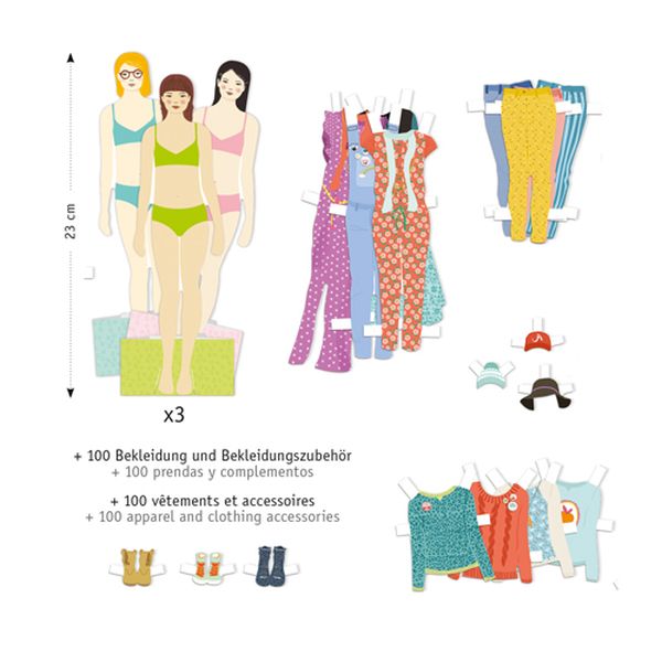 90 vêtements en papiers déjà découpés, avec des languettes, pour habiller à l’infini les 3 amies. De quoi vraiment varier les plaisirs.