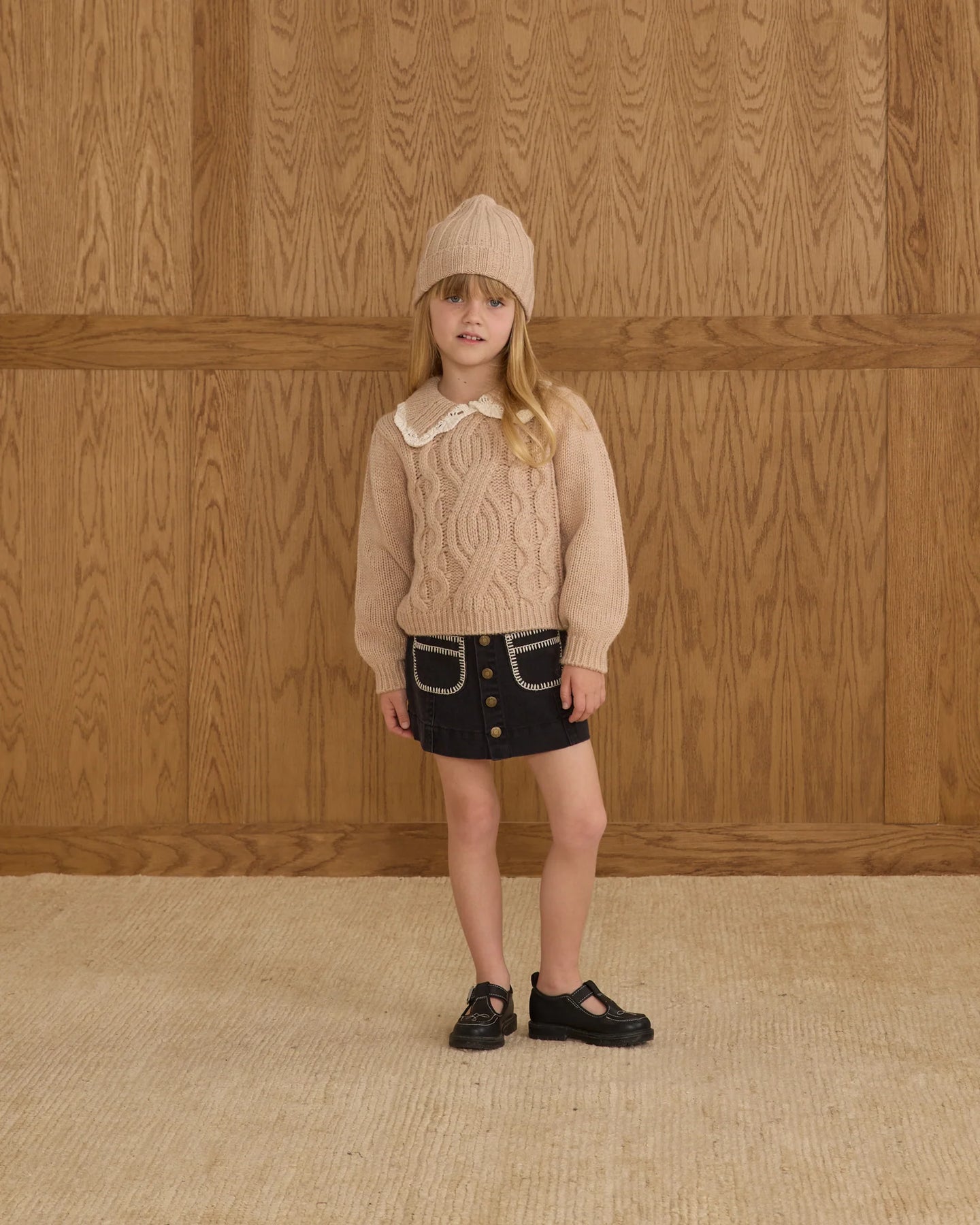 Notre pull Alice tricot à tricot ajoute un style charmant avec un col nervuré accentué par de délicats détails de crochet.