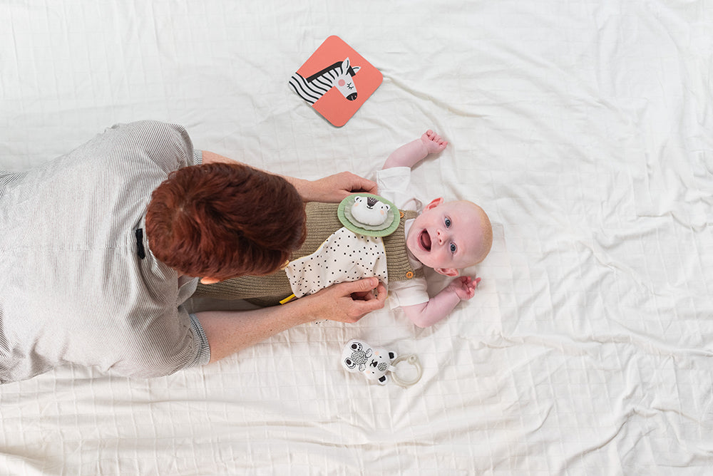 • Objet de transition 3m+ - À partir d'environ 6 mois, les bébés peuvent développer un sens de séparation de leur soignant. Cela peut être plus facile à gérer si votre bébé a adopté un objet de transition qu'il peut utiliser pour se rassurer. Une couverture ou un jouet doux qui est câlin, familier et qui porte l'odeur de leurs parents peut aider bébé à se calmer.