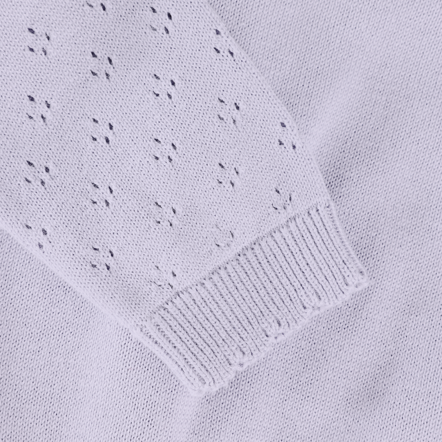 Knit cardigan from the brand EN FANT. This long-sleeved cardigan features ruffles at the shoulders and a button-front closure. It is knitted in a pointelle pattern.