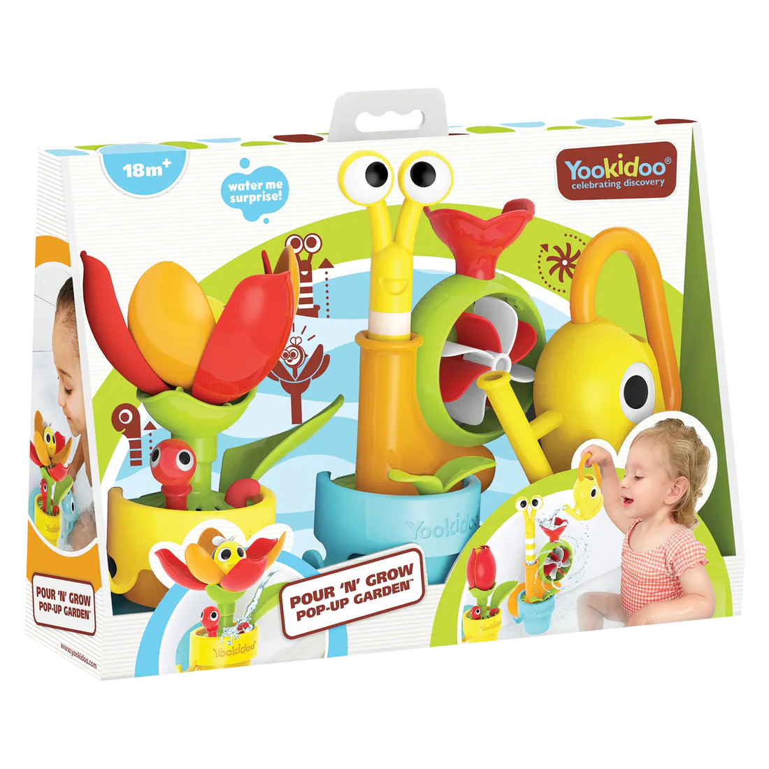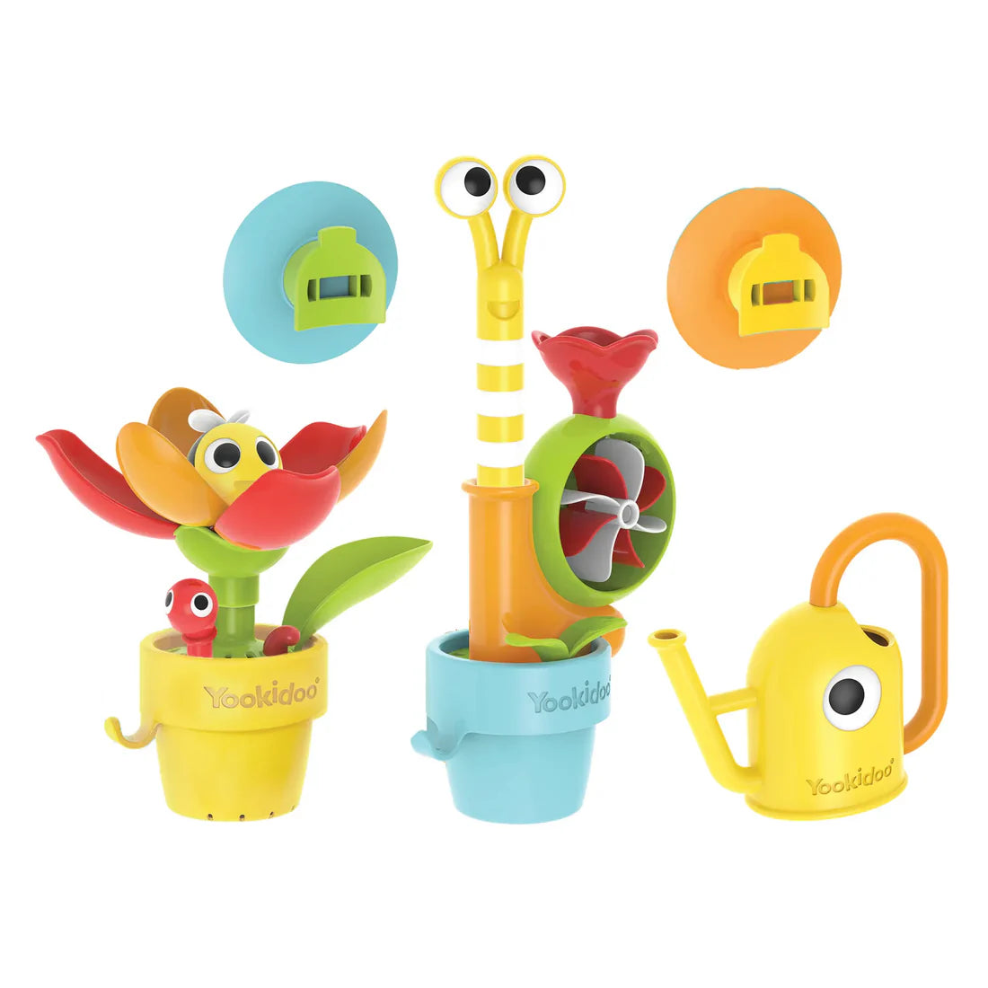 Includes a watering can and two suction cup bath hangers.
