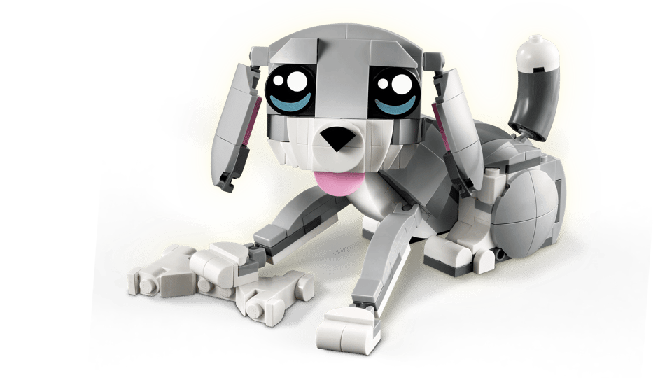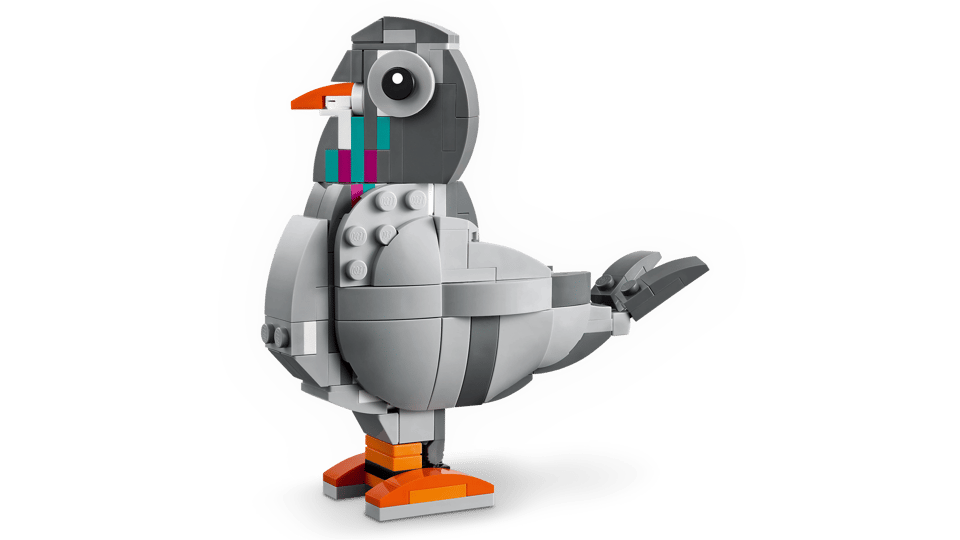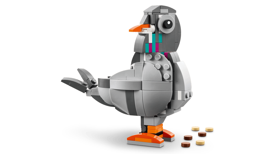 Girls and boys can build three different LEGO animal playsets with the same bricks: a posable cat that can sit, stand, and bounce; a cute, articulated dog with a bone; and a pigeon with crumbs. The three scenes make a great LEGO gift for kids to display and enjoy imaginative play.