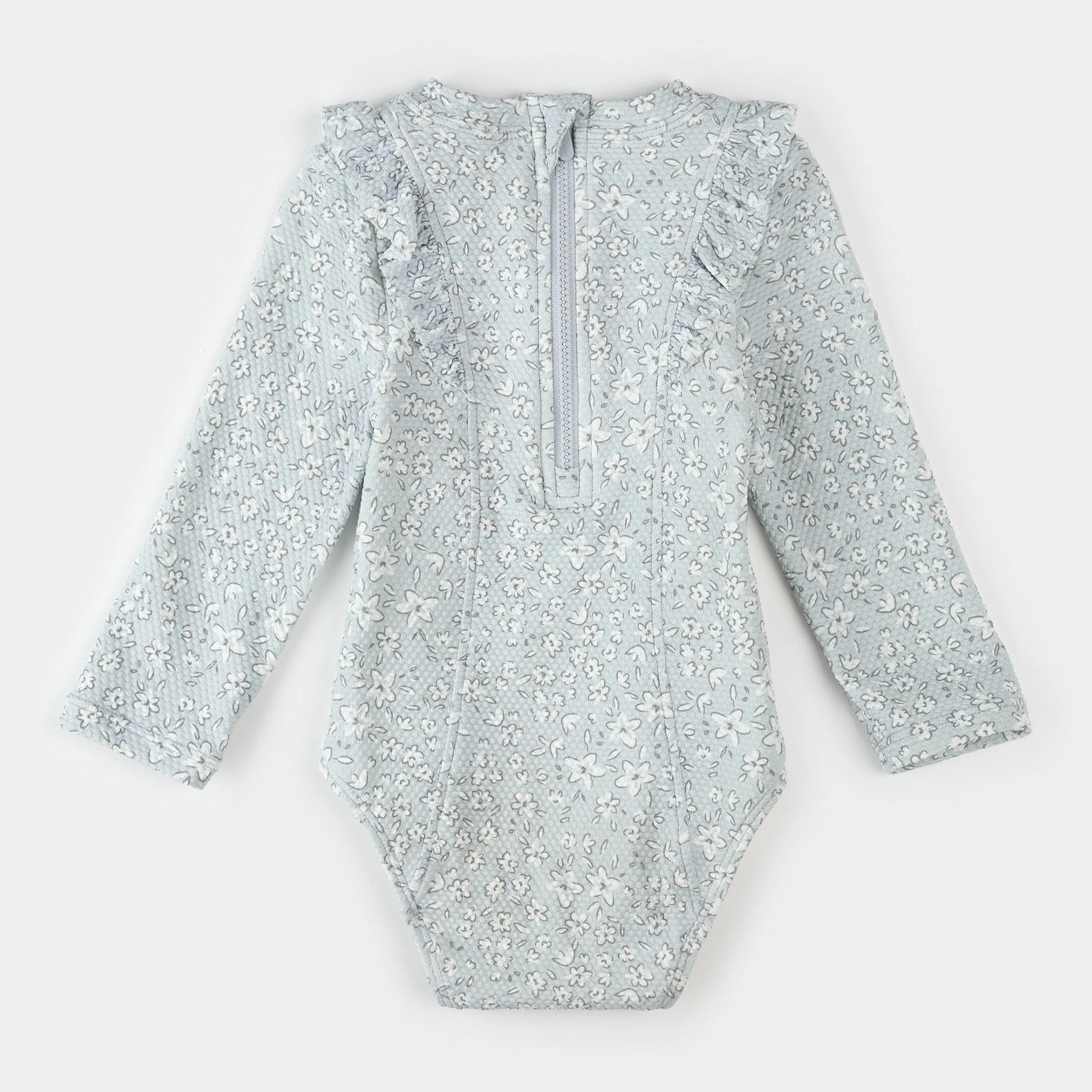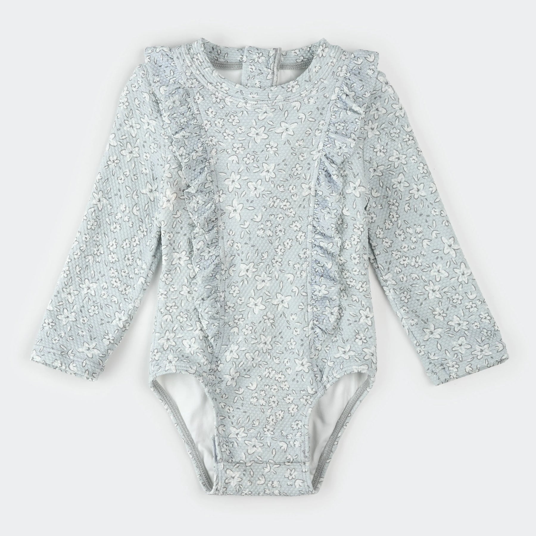Fresh and floral, this pastel blue one-piece swimsuit offers a charming retro style for summer days by the water. With its long sleeves and built-in UPF 50+ sun protection, it keeps her well-covered and comfortable in the sun. Made from quick-drying waffle-knit fabric, it provides all the flexibility needed for splashing, diving, and playing. A back zipper makes it easy to get on and off, so she can go from water to play in a flash.