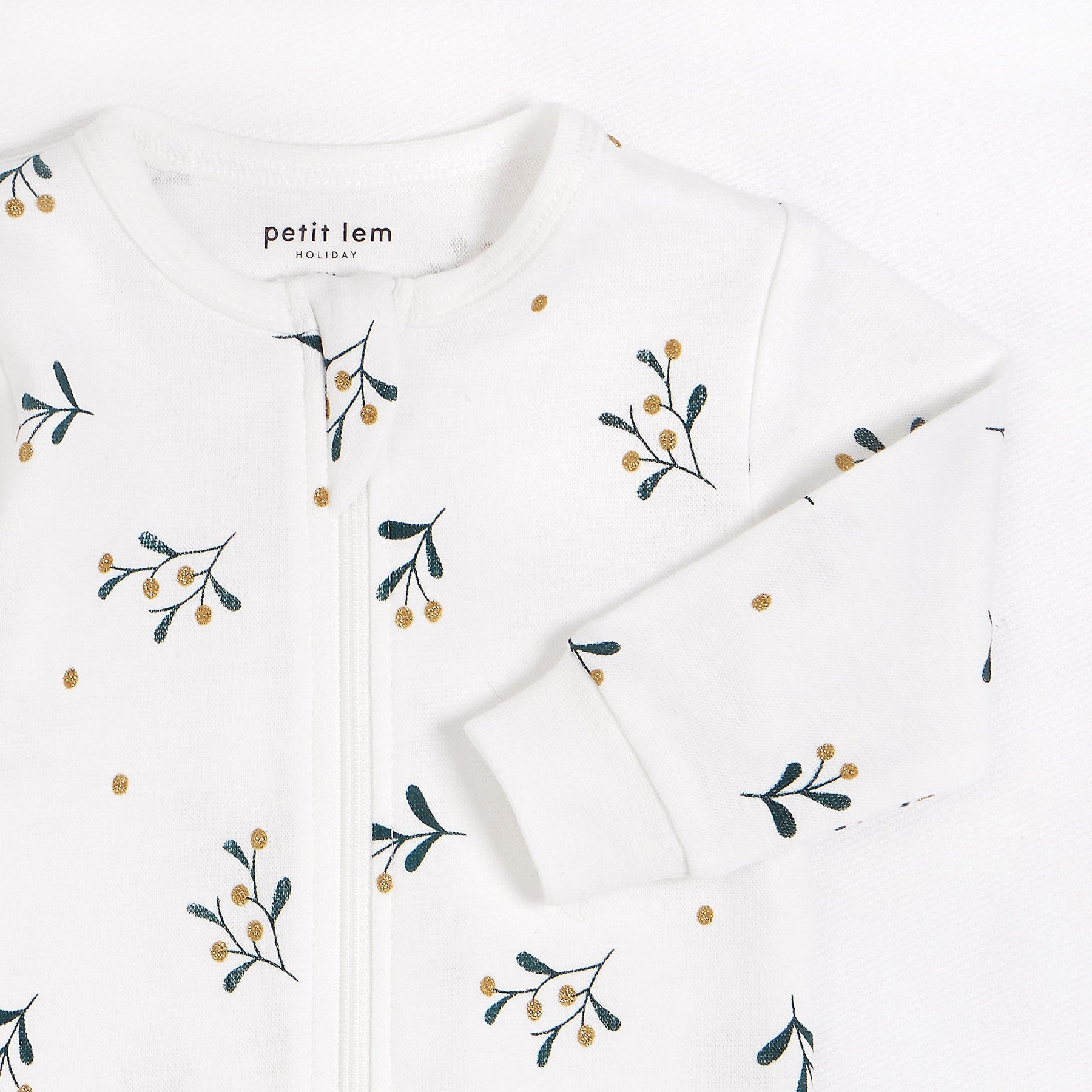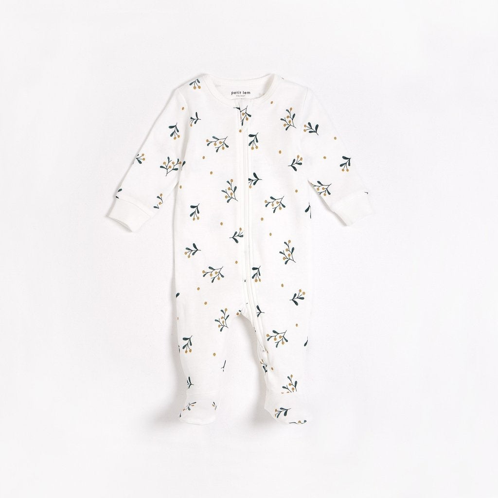 This mistletoe-adorned sleeper is the perfect garment for your baby to share cuddles and kisses on cold winter mornings. The elasticated cuffs and integrated feet will keep your precious treasure warm and comfortable during naptime, especially since the organic cotton will wrap him in softness. The zipper on the front and along the leg makes changing easy and helps prevent unpleasant little incidents.