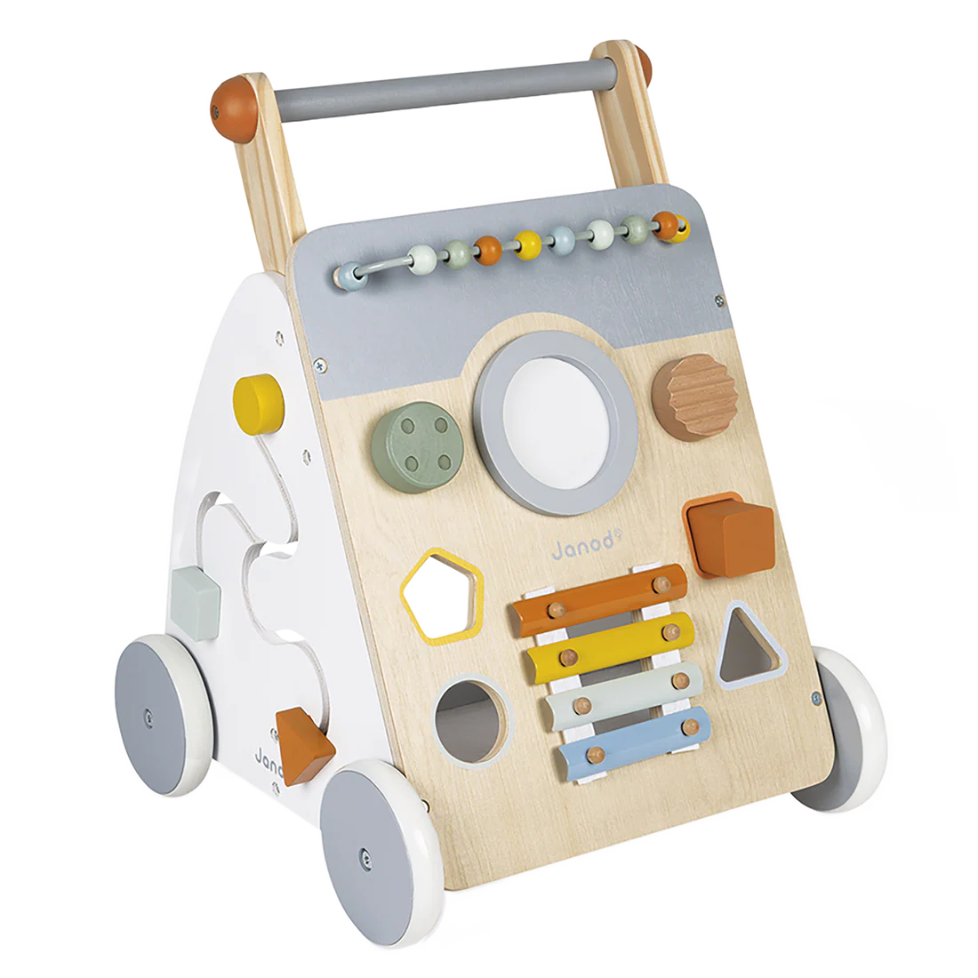 This pretty multi-activity push cart is particularly suitable for learning to walk. It will accompany your child in complete safety: its invisible and removable brake allows you to block the wheels and release them gradually in order to control the speed of the cart during learning. In addition to walking, your child will be able to test their fine motor skills as well as their dexterity with the 9 fun activities offered: abacus, shape box, maze, gears, sound rotary button, "scratch-scratch", rotating magnifying mirror, drum and metal xylophone to develop their musical awareness. Very clever, it is equipped with a felt mat to reduce noise and cushion the fall of the cubes. Finally, its wheels are silent! If we add to all this, its contemporary design and soft colors, we can only fall in love! We love the natural wood, white and gray, highlighted by the colorful details of the many activities of this first age cart for baby! The Sweet Cocoon collection is made up of first-age toys in soft colors and rounded shapes, offering fun discovery activities for baby!